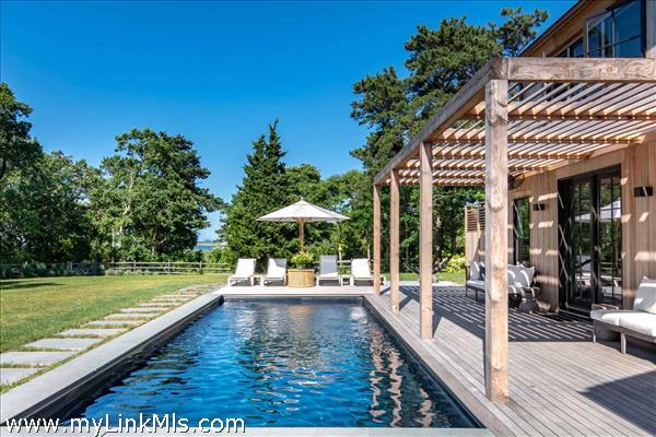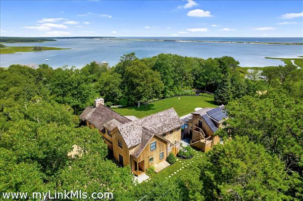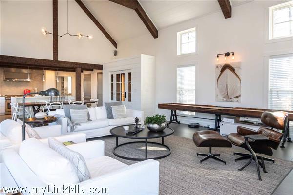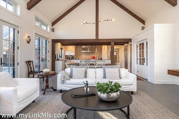 CHIC MODERN FARMHOUSE WITH CARRIAGE HOUSE, POOL + WATER VIEWS. From the moment you enter, this home is nothing short of AMAZING. Designed by architect and interior designer, Stefan Castellucci, the property features chic and sophisticated design elements coupled with exceptional space planning for indoor-outdoor living. The dramatic two-story Great Room features a floor-to-ceiling fireplace and vaulted ceilings accented by rough hewn beams, sleek tile floors with radiant heat -- plus multiple French doors and windows that bathe the home with natural sunlight. The open-designed Great Room is flanked by a spacious screened porch with water views on one end and a gourmet cook’s kitchen, with large center island, commercial appliances and custom tile on the other. A retractable kitchen window opens up to an outdoor counter with seating for idyllic summertime entertaining and there are three sets of French doors that also open to the outdoor living area, which is perfectly designed for poolside lounging and dining around a 30x12.5-foot saltwater pool and an expansive lawn. The detached Carriage House integrates perfectly with the pool and offers a Lounge with wet bar, game area and half bath. There are a total of four (4) bedrooms in the Main House, including two Primary Suites (one on each floor) and a fifth bedroom suite in the detached Carriage House. Enjoy morning walks along The Boulevard, kayaking and boating from the nearby boat launch and easy access to nearby beaches and the bicycle path from this exceptional property, which is being offered TURNKEY with hand-selected designer furnishings included.